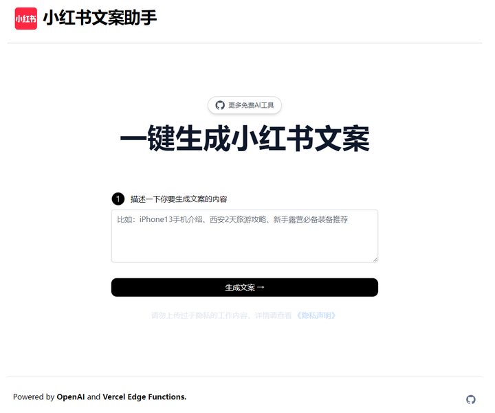 界面超级简洁,一键生成小红书文案的必备助手。但是缺点实现大家自己输入文案内容,这点不如有模板的工具方便。